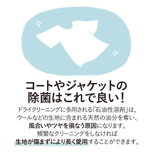 ノズルから広がる軽やかなミストは、天然由来の抗菌・消臭成分を含み、衣類や布製品をやさしくリフレッシュ。
