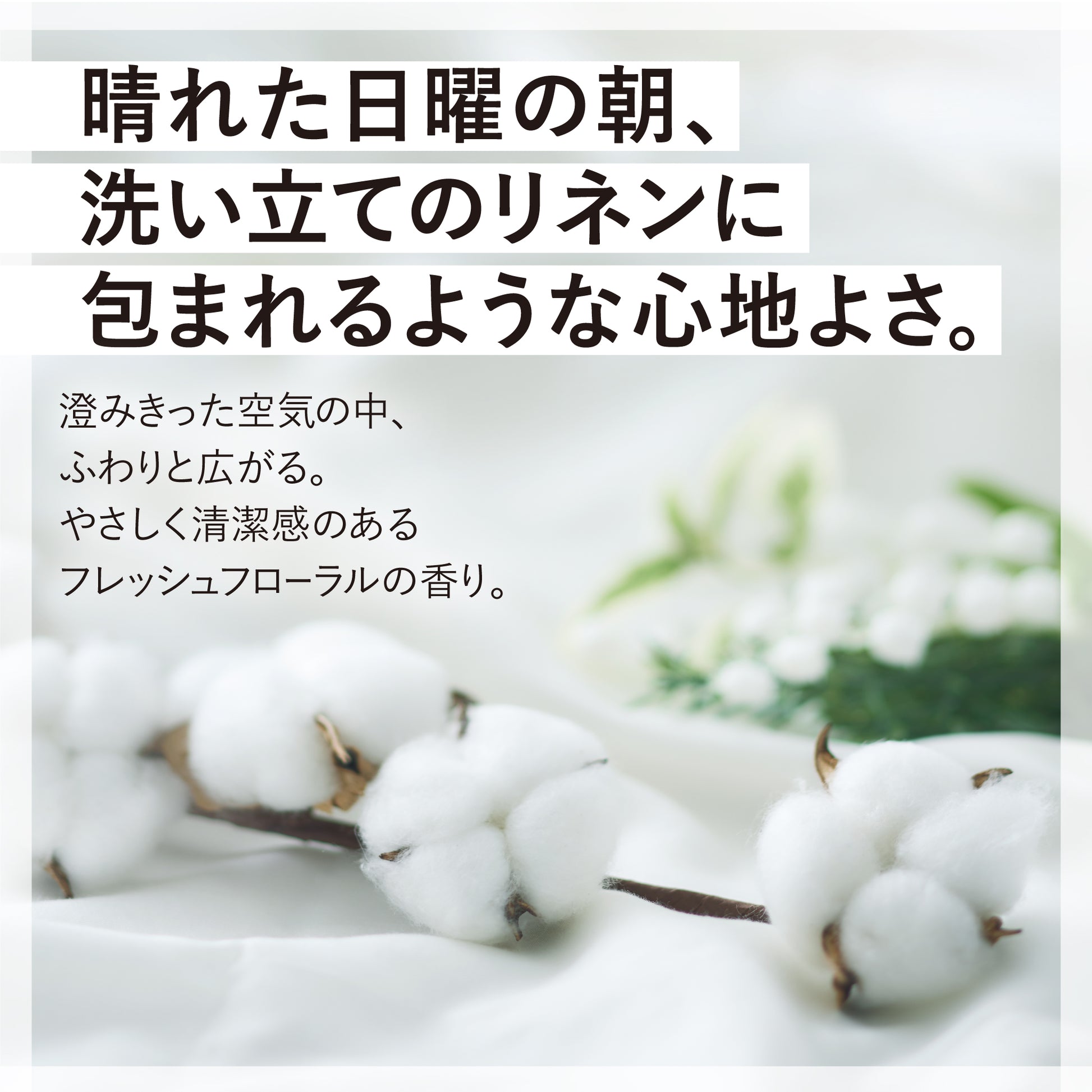 香水グレードの香料をファブリックミストに合わせた濃度で調香し清潔感のある奥行きの香りを実現しました。洗いたてのリネンを思わせる、すっきりとした心地よさが広がります。